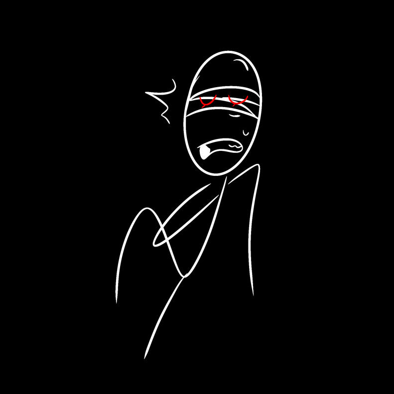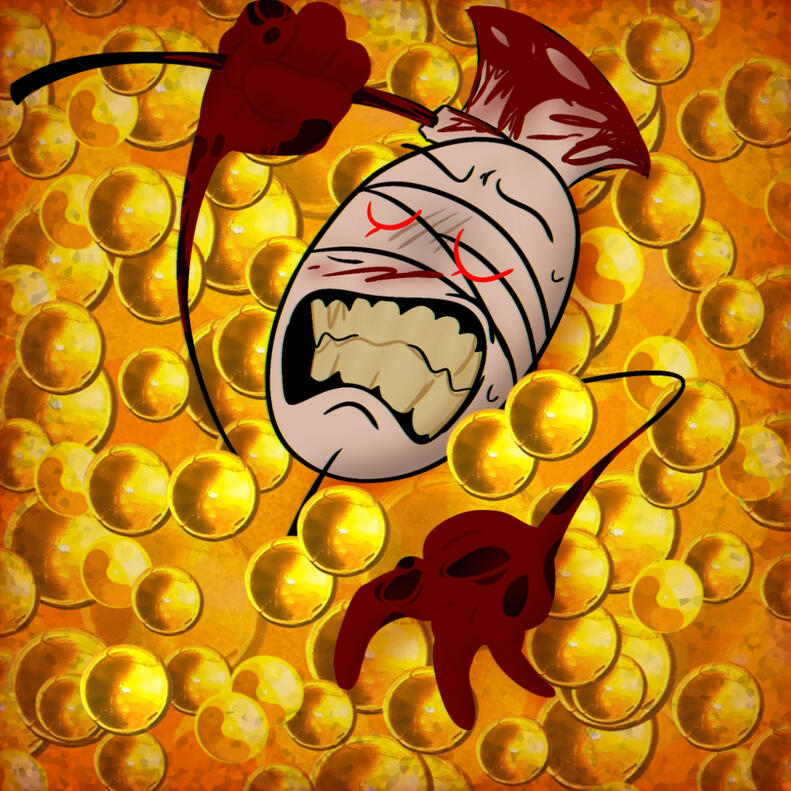 you're shaken awake and yelled at by Jumpy. a slimey claw grabs you and you stumble to your feet, axe in hand. you swing where there's gurgles, which is all around you.